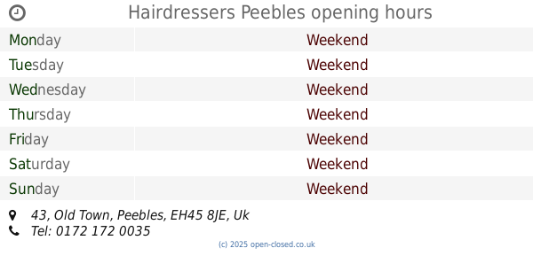Add it to your website, your phone or even your desktop - opening times, phone numbers and the road to Office of the Hairdressers In Peebles, 43, Old Town.